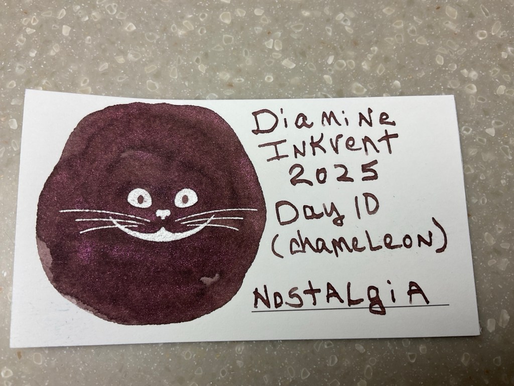 Nostalgia is a chameleon ink. The bottle label shows this ink as a light purple. But it shows up more as a dark purple, maybe with a little maroon?