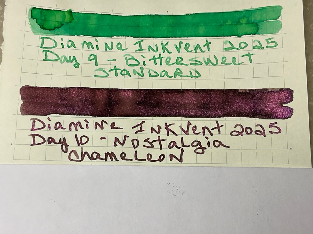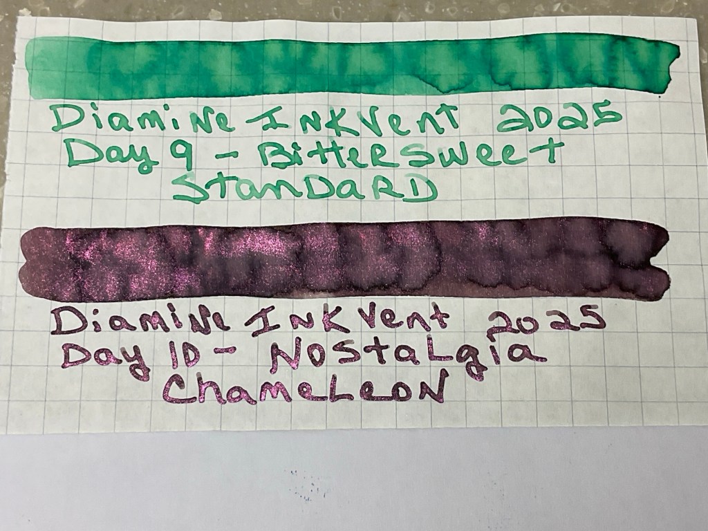 I like this ink. At first, I wasn’t sure about it. It is sparkly and has a base of purple. That really does it for me. But I think because it is dark, sparkly and a little moody, this will be a nice ink that I can add to my collection of 38 inks, not counting the 25 in the Inkvent calendar. Of course, I’ll have to see if the sparkle appears in my fine nib.